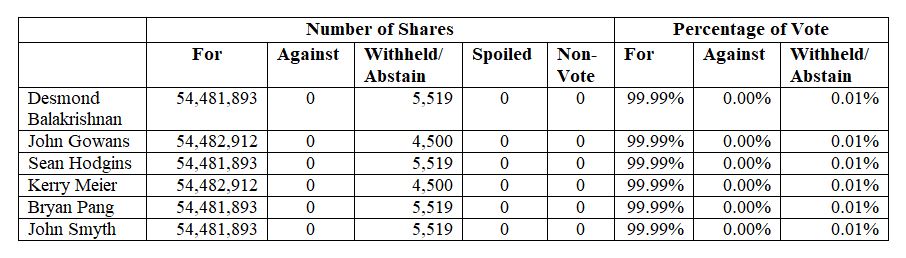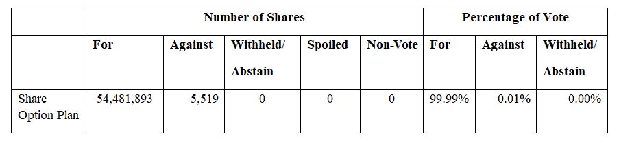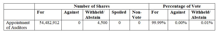 Shareholders voted in favour of all of the items of business put forth at the meeting as set out below. A total of 54,487,412 shares were represented at the meeting, representing 63.22 per centof the total issued and outstanding shares.
