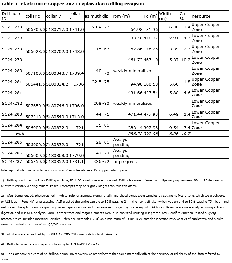 Vice-president of exploration Jerry Zieg shared, "We're very pleased with these results, which continue to show that additional exploration drilling has the potential to increase our mineral resource and extend the projected mine life of the Black Butte copper project."