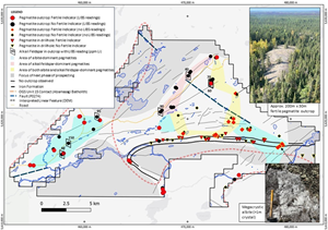 - Abundant fertile indicator minerals have been identified in pegmatites, containing one or more of muscovite, garnet, tourmaline, cordierite, and a widespread unidentified blue-green mineral (Figure 1).