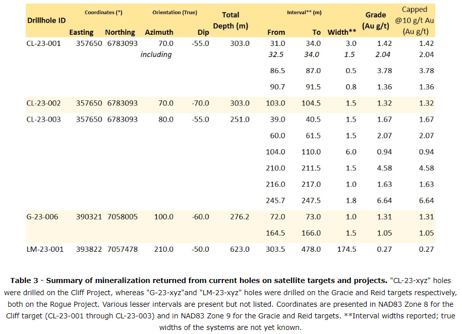 Phase 2 drilling at Gracie encountered sedimentary rocks with varying degrees of hornfels alteration, indicating proximity to an intrusion, and low-density sheeted quartz veins bearing rare instances of trace visible gold. Assays for G-23-006, which was aborted due to pad stability issues short of reaching its target, returned localized intervals of anomalous gold mineralization (see the table entitled "Summary of mineralization returned from current holes on satellite targets and projects"). Analytical results for an additional three holes from Gracie, and a single-hole phase 1 program at Cujo are pending.