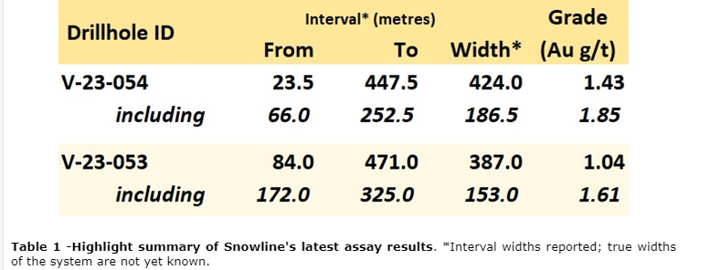 "The current set of drill results includes yet another hole, in yet another part of the Valley intrusion, that expands the extent of known mineralization with an unusually high-grade intersection for a reduced intrusion-related gold system carried over hundreds of metres from surface," said Scott Berdahl, chief executive officer and director of Snowline. "We weren't expecting the length and intensity of gold mineralization encountered in V-23-054, nor to see it extend to depth in the southeastern part of the system, revealing a potential new zone of mineralization. Once again we are impressed by the scale and continuity of our Rogue project's Valley target, which remains open in multiple areas. We are keen to see how our understanding of the system evolves with the large quantity of drill assays that are forthcoming for the target."