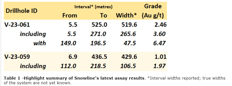 Hole V-23-059 is collared in coarse-grained granodiorite of the Valley stock, on section between V-23-044 (295.9 m at 1.32 g/t Au from surface, including 157 m at 2.03 g/t Au, see Snowline news release dated Sept. 11, 2023) roughly 132 m to its southwest and V-22-027 (481.5 m at 0.69 g/t Au, including 250 m at 1.01 g/t Au, see Snowline news release dated Jan. 18, 2023) roughly 108 m to its northwest.