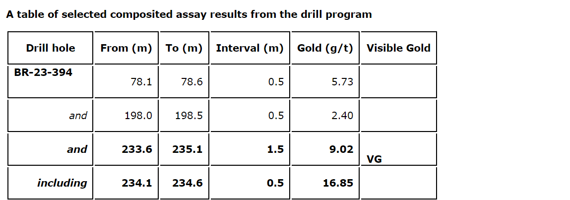 - 9.02 g/t gold over 1.5 metres (233.6 metres to 235.1 metres) in hole BR-23-394, including 16.85 g/t gold over 0.5 metre.