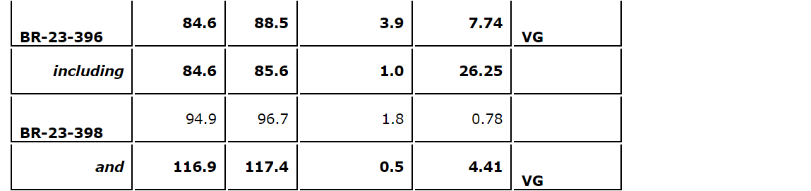 - 7.74 g/t gold over 3.9 metres (84.6 metres to 88.5 metres) in hole BR-23-398, including 26.25 g/t gold over 1.0 metre;