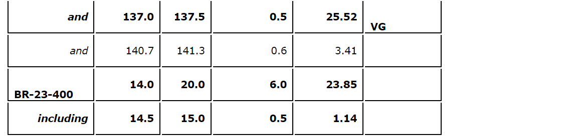 - 23.85 grams per tonne gold over 6.0 metres (14.0 metres to 20.0 metres) in hole BR-23-400, including 159.09 g/t gold over 0.5 metre and 122.74 g/t gold over 0.5 metre;