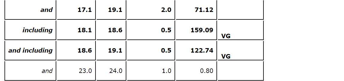 - Intervals are reported as core length only. True widths are estimated to be between 70 per cent and 100 per cent of the core length.