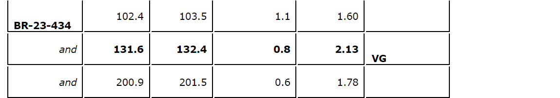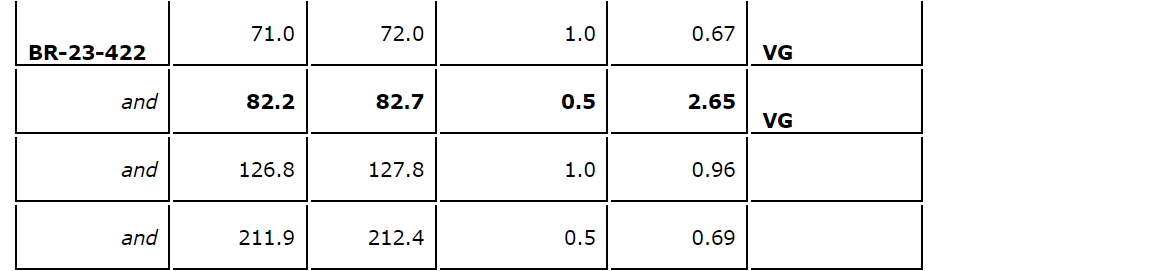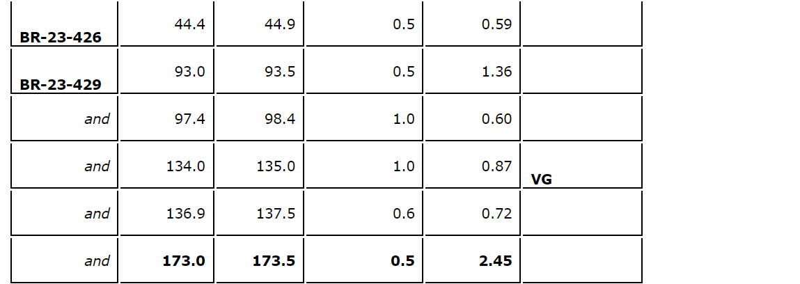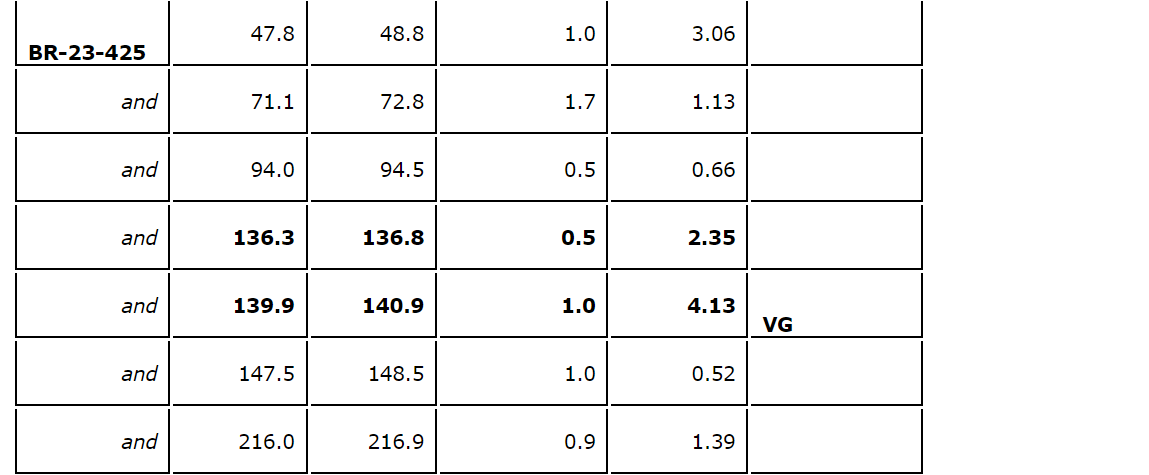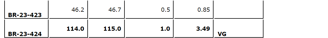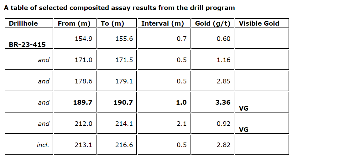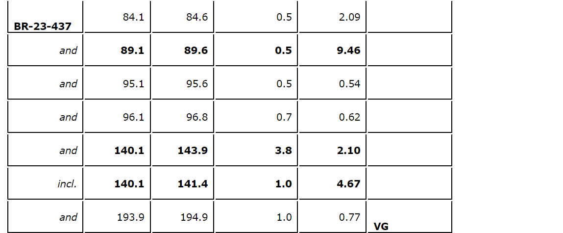 - 2.10 g/t gold over 3.8 metres (140.1 metres to 143.9 metres) in hole BR-23-437, including 4.67 g/t gold over one metre;