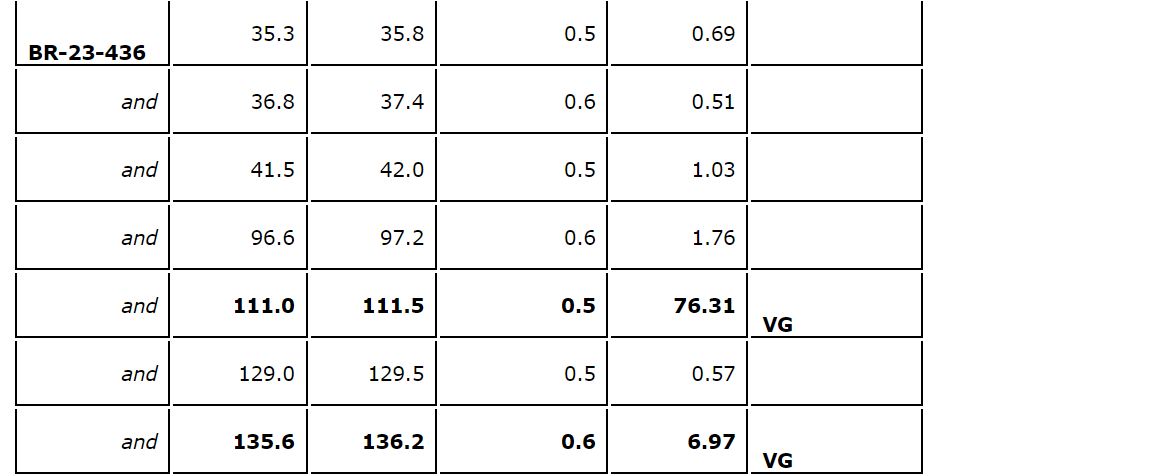- 76.31 grams per tonne gold over 0.5 metre (111.0 metres to 111.5 metres) in hole BR-23-436;