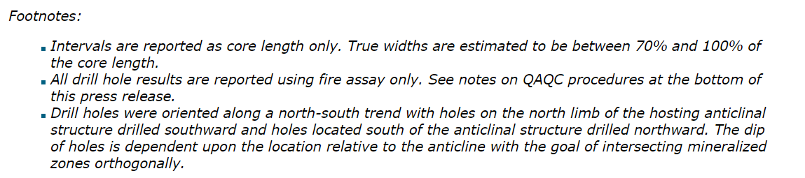 All assays in this press release are reported as fire assays only. For samples analyzing greater than 0.5 g/t Au via 30 g fire assay, these samples will be reanalyzed at Eastern Analytical via total pulp metallics. For the total pulp metallics analysis, the entire sample is crushed to minus-10 mesh and pulverized to 95 per cent passing minus-150 mesh. The total sample is then weighed and screened to 150 mesh. The plus-150-mesh fraction is fire assayed for Au, and a 30 g subsample of the minus-150-mesh fraction is analyzed via fire assay. A weighted average gold grade is calculated for the final reportable gold grade. Total pulp metallics assays for drill holes cited within this press release may be updated in a future news release.