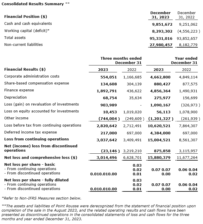 - Recorded a net comprehensive loss in 2023 of $15,880,379, or seven cents per share, compared with a loss of $11,677,264, or six cents per share, in 2022, resulting from higher finance expense, a loss on the revaluation of investments and a higher deferred income tax expense, partially offset by an increase in other income and decrease in net loss on discontinued operations in 2023;