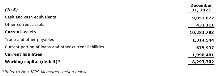 As of Dec. 31, 2023, the company had working capital of $8,293,302, which includes a cash balance of $9,851,672.