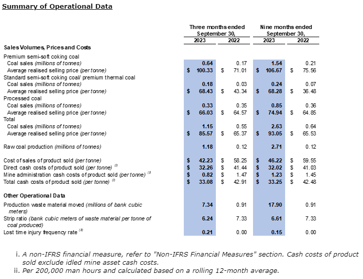 The company experienced an increase in the average selling price of coal from $65.4 per tonne in the third quarter of 2022 to $85.6 per tonne in the third quarter of 2023, as a result of improved market conditions in China, expansion of its sales network and diversification of its customer base. The product mix for the third quarter of 2023 consisted of approximately 56 per cent premium semi-soft coking coal, 15 per cent standard semi-soft coking coal/premium thermal coal and 29 per cent of processed coal compared to approximately 31 per cent premium semi-soft coking coal, 5 per cent standard semi-soft coking coal/premium thermal coal and 64 per cent processed coal in the third quarter of 2022.