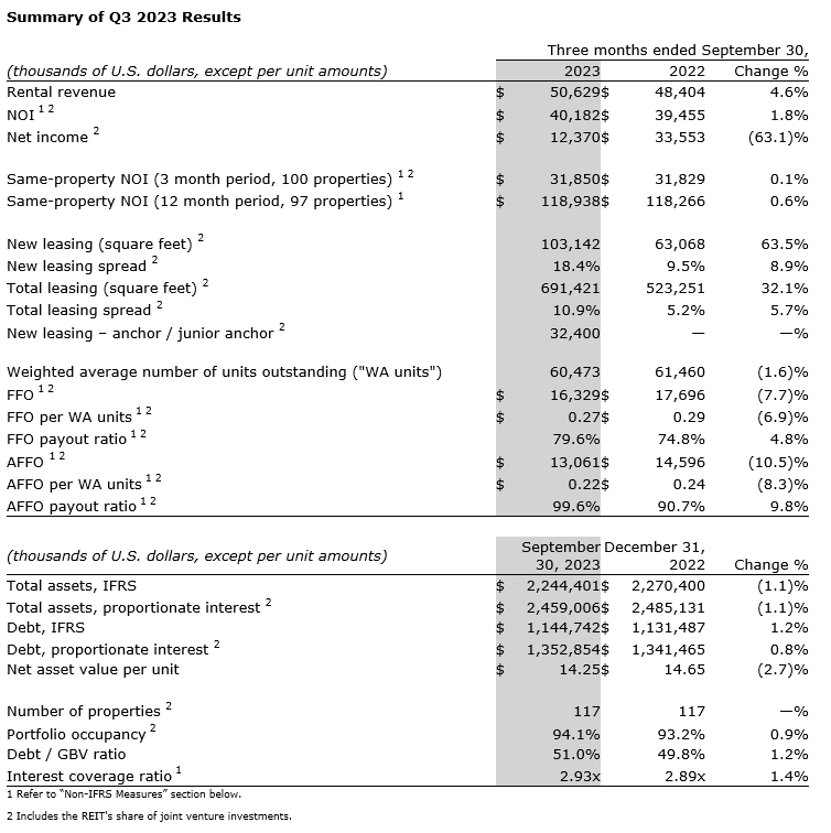 Most of the REIT's total debt is fixed with a weighted-average interest rate of 4.2 per cent, and there remains positive leverage between the current cost of financing and the REIT's third quarter 2023 international financial reporting standard value at a 7.0-per-cent capitalization rate.