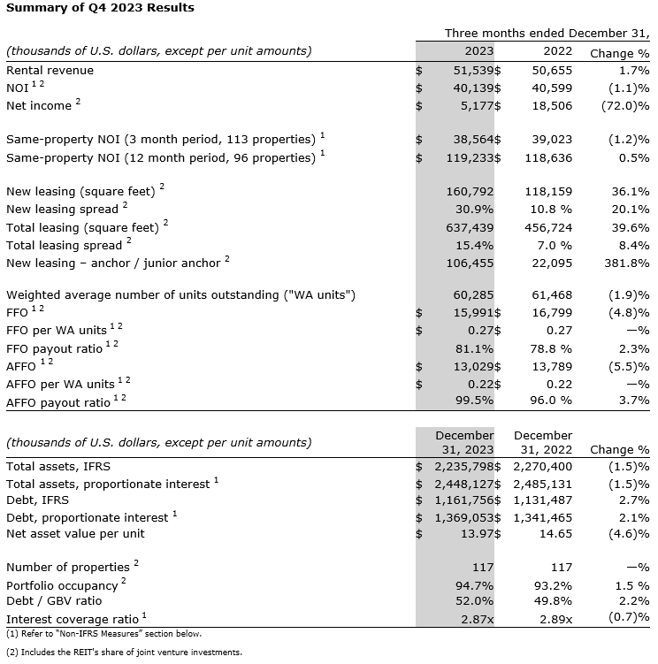 "In a year that challenged much of the broader real estate industry, our portfolio of grocery-anchored real estate continued to demonstrate exceptional resilience and operational performance," said Blair Welch, chief executive officer of Slate Grocery. "Our team set a new high watermark for annual leasing volume in 2023 at some of our highest rental spreads on record, which we expect to convert to healthy [net operating income] growth in the coming years. Looking ahead, we believe our below-market in-place rents, coupled with favourable supply-demand dynamics in the grocery-anchored sector, present the [real estate investment trust] with significant runway to further grow our revenue and enhance the durability of our income."