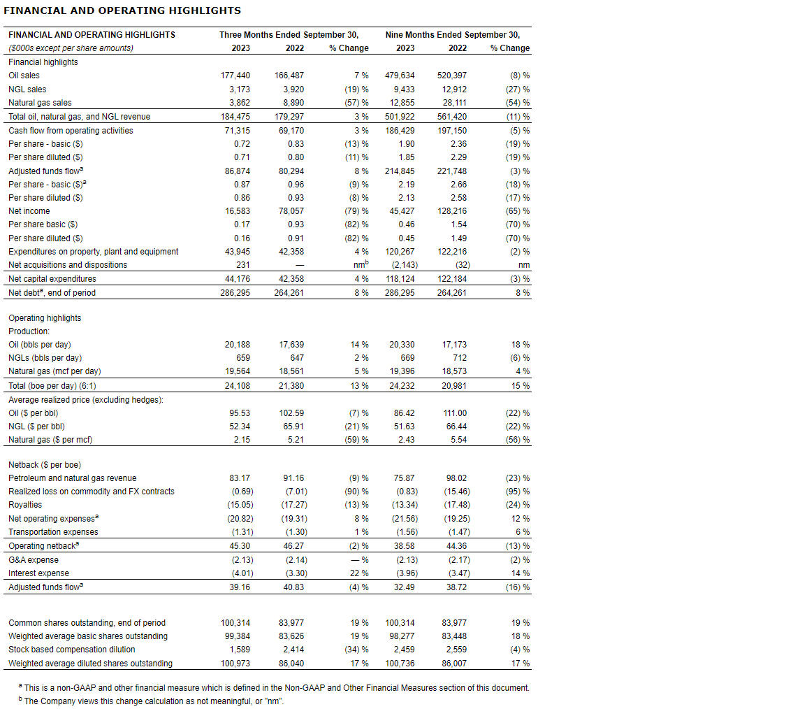 Achieved average daily production of 24,108 boepd (barrels of oil equivalent per day) (86-per-cent liquids) during Q3 2023, an increase of 13 per cent over Q3 2022 production of 21,380 boepd (86-per-cent liquids);