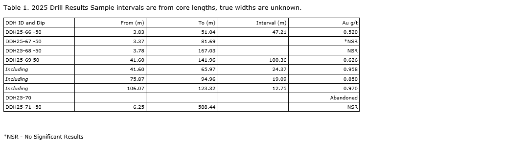 Samples were shipped to AGAT Laboratories, in Calgary, Alta., an independent laboratory, with ISO/IEC 17025:2017 accreditation. The samples were tested by ICP (inductively coupled plasma) utilizing aqua regia digest -- metals package, ICP-OES (optical emission spectroscopy)/ICP; gold was also fire assayed with a 30g sample weight. The samples were across a one-metre core length.