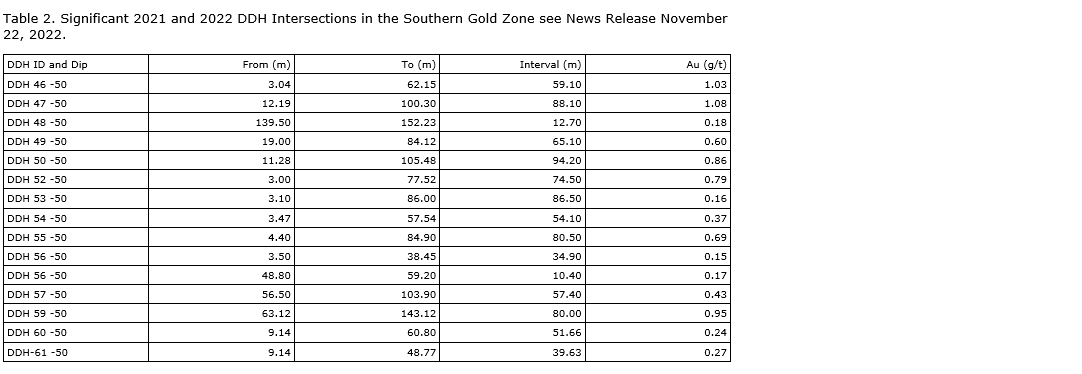 The southern gold zone is primarily hosted by a fine-grained biotite diorite pervasively altered to variable amounts of calcite, chlorite, sericite, albite and K feldspar. Disseminated very fine-grained pyrite, hematite and relatively minor chalcopyrite are common and also noted in microfractures and lesser calcite-chlorite veinlets. Gold intervals more than 0.10 gpt are spatially associated with variable strengths of alteration assemblages and of pyrite-hematite and chalcopyrite. Very fine-grained (more than five microns) gold is difficult to recognize in some samples and to confirm would require scanning electron microscopy of polished thin sections.