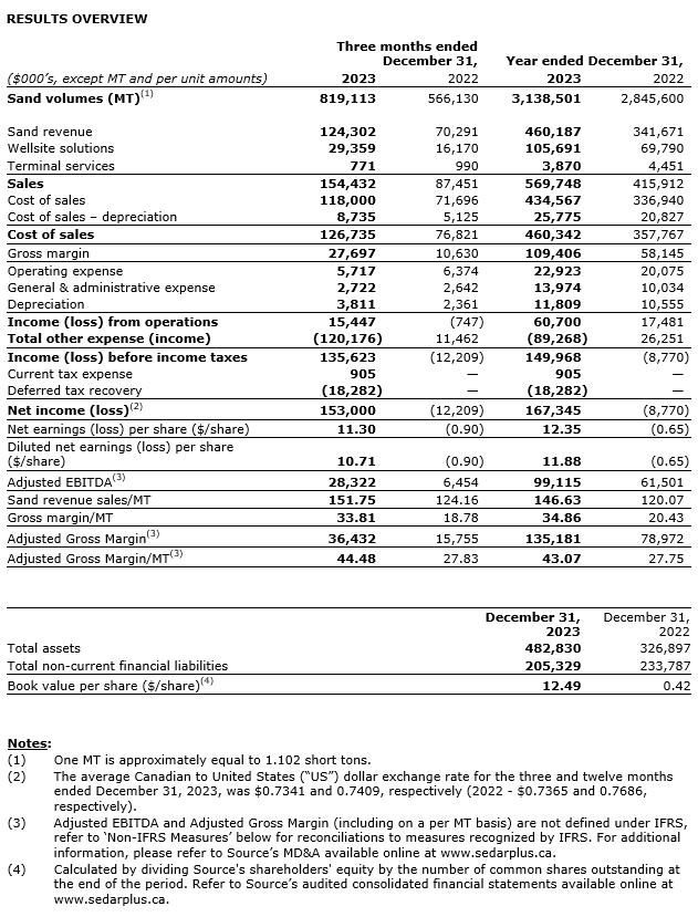 These results should be read in conjunction with Source's audited consolidated financial statements for the years ended Dec. 31, 2023, and Dec. 31, 2022, together with the accompanying notes, and its corresponding MD&A for such periods. The financial statements and MD&A and other information relating to Source, including the annual information form, are available under the company's SEDAR+ profile. The financial statements and comparative statements have been prepared in accordance with IFRS as issued by the International Accounting Standards Board. Unless otherwise stated, all amounts are expressed in Canadian dollars.