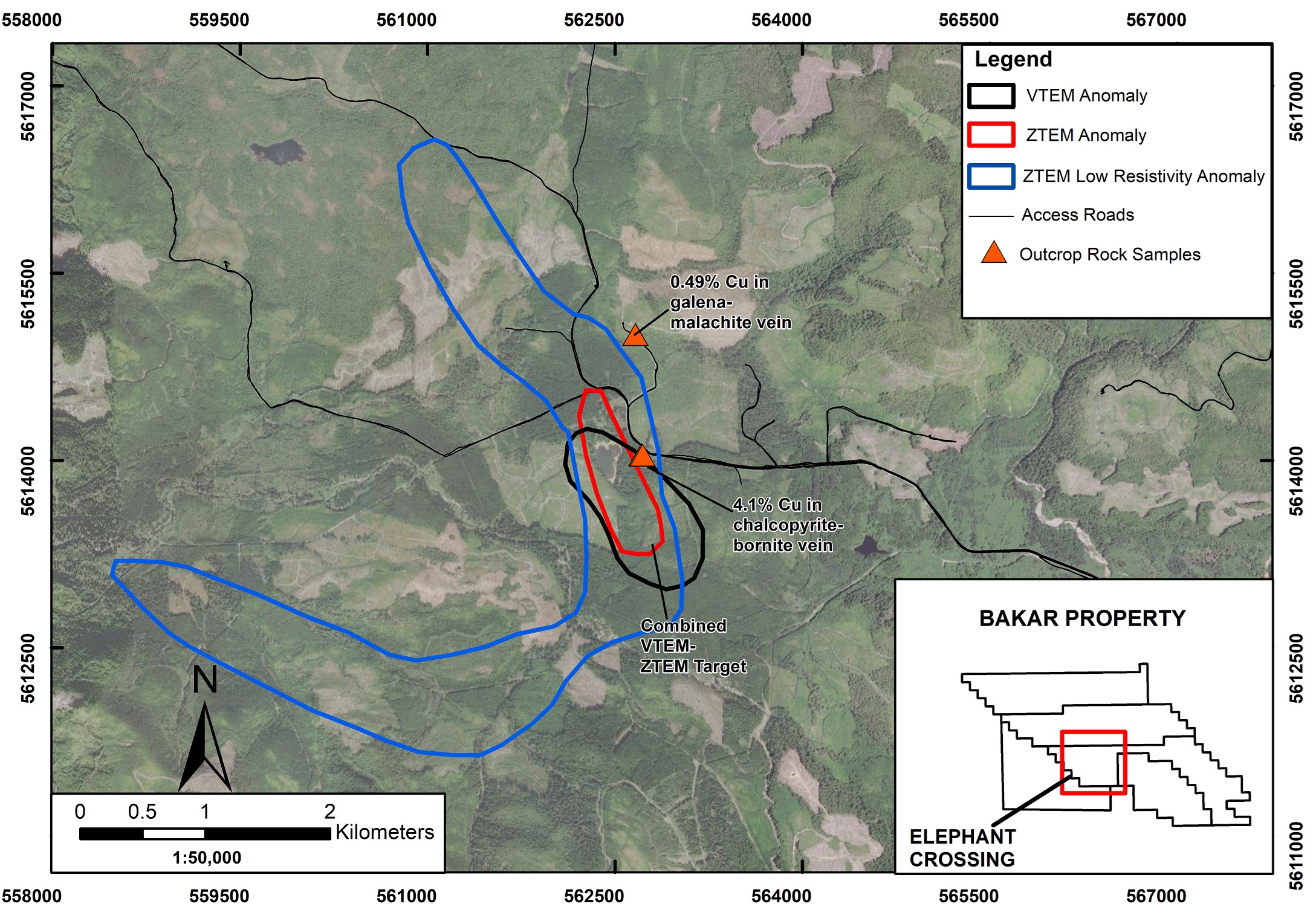 Two rock chip samples recovered in 2021 from outcrop at the edge of the covered coincident VTEM and ZTEM anomalies returned 0.49% Cu and 4.13% Cu. This is a previously unknown mineral occurrence and represents a new discovery at Bakar. Samples are characterized by intense chlorite-epidote alteration and sheeted quartz-epidote veins with pyrite, chalcopyrite and bornite.