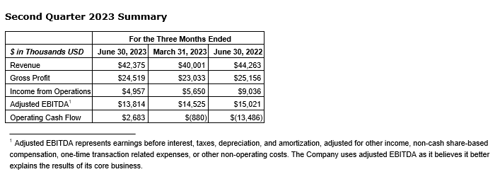 Income from operations for the second quarter of 2023 was $5.0-million, compared with $9.0-million in the same quarter last year. Net loss was $6.6-million, compared with a et income of $33.8-million for the second quarter of 2022, primarily driven by a $35.2-million change in the non-cash accounting revaluation of the derivative liability related to the company's convertible note.