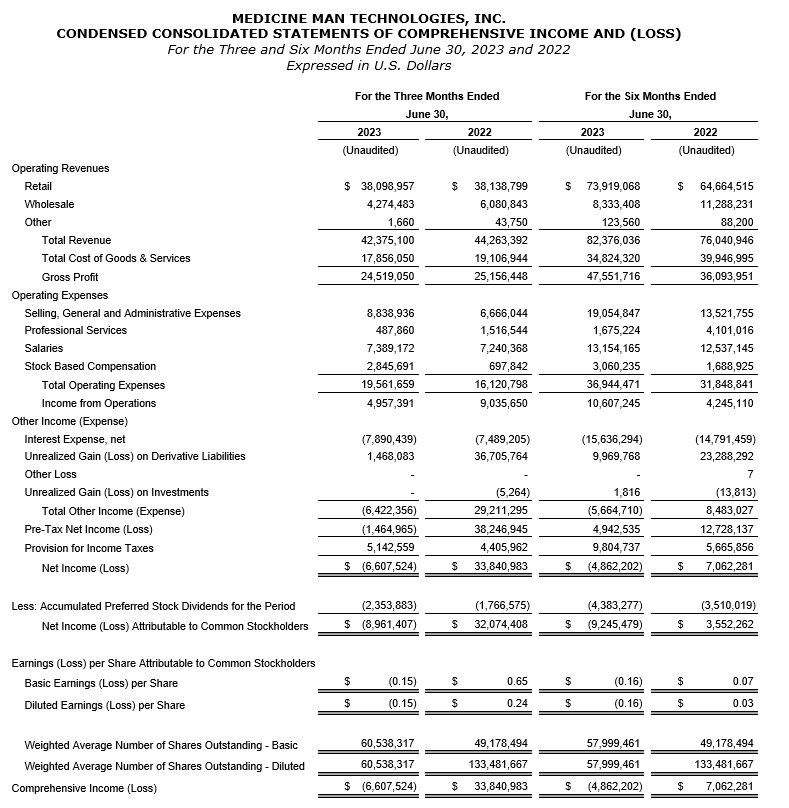 Medicine Man Technologies Inc., operating as Schwazze, has released its financial and operational results for the second quarter ended June 30, 2023.