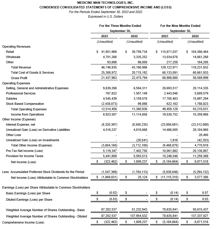 Medicine Man Technologies Inc., operating as Schwazze, has released financial and operational results for the third quarter ended Sept. 30, 2023.