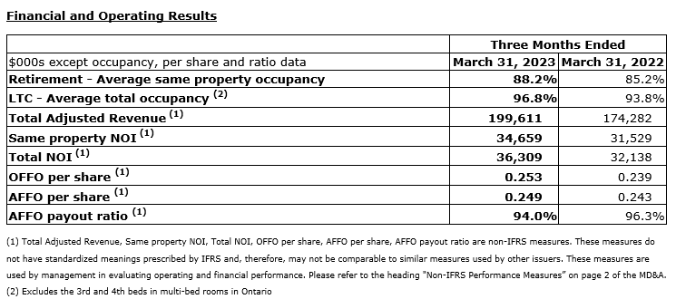 "As we move further into 2023, we have many reasons to be encouraged," said Nitin Jain, president and chief executive officer. "Strong demand for our retirement residences supported significant year-over-year growth in our same-property NOI, our long-term-care communities continued to stabilize and our focus on cost management is showing early signs of success. In addition, slowing inflation and a pause to interest rate hikes are further adding to our optimistic outlook for the balance of the year."