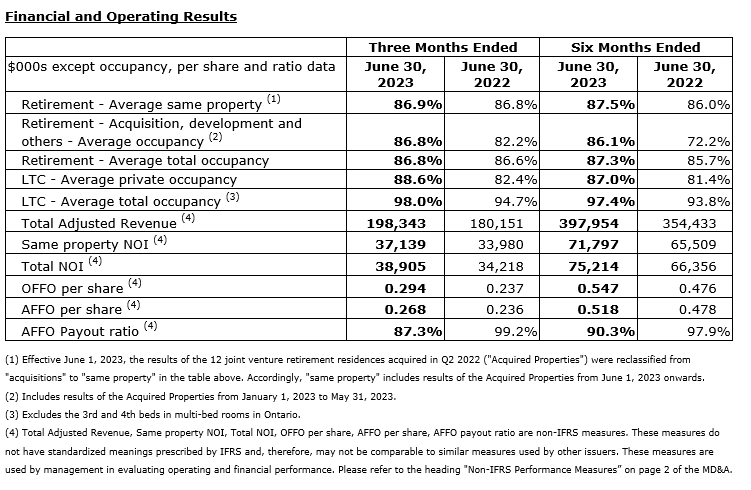 Long-term-care (LTC) occupancy: Average occupancy increased by 330 basis points (bps) year over year to 98.0 per cent in Q2 2023.