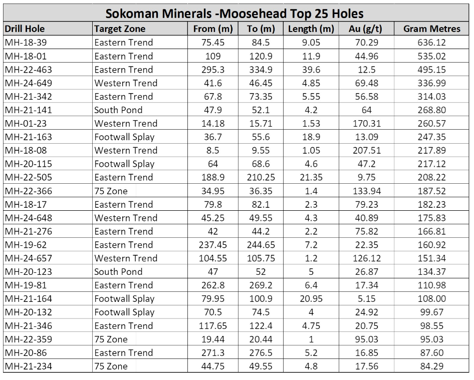 Sokoman Minerals Corp. will resume diamond drilling at the 100-per-cent-owned Moosehead gold project in central Newfoundland. The initial focus will be a series of deep, 1,000-metre-depth, downhole drill holes testing the eastern trend and western trend gold zones for depth extensions, as well as testing for undiscovered parallel zones. Since 2018, a total of 135,325 metres (m) of core in 672 drill holes, across the property, have resulted in the definition of five significant zones of gold mineralization and several smaller, less defined zones, with most remaining open for expansion. All the main gold zones have high-grade intersections of at least 100 gram-metres of gold to a maximum of 636.12 gram-metres from MH-18-39. Please see the attached table of Moosehead's top 25 holes.