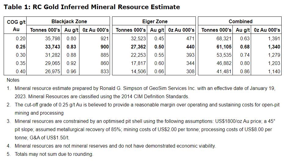 The Initial Mineral Resource Estimate of 1,340,000 ounces of gold at the RC Gold Project is comprised of two deposits: the Blackjack deposit containing 900,000 ounces of gold at a grade of 0.83 g/t gold and the Eiger deposit containing 440,000 ounces of gold at a grade of 0.50 g/t gold (see news release dated January 19, 2023). Both of these deposits are at/near surface, are potentially open pit minable and amenable to heap leaching, with initial bottle roll tests indicating that the gold is not refractory and has high gold recoveries of up to 94% with minimal NaCN consumption (see News Release July 13, 2022).
