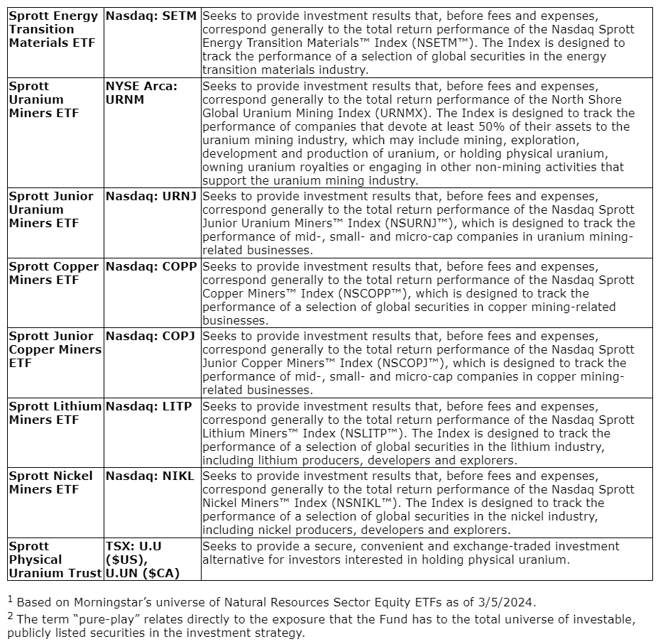 COPP is part of Sprott's energy transition ETF suite, which is focused on the investment opportunity of the critical materials needed to generate, transmit and store cleaner energy. The suite includes the ETFs shown in the associated table.