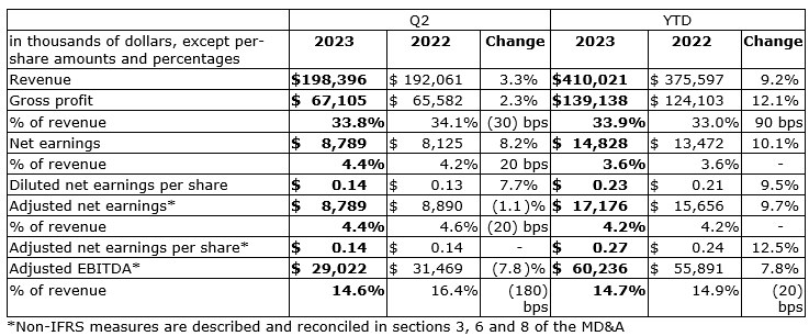 Net earnings were $8.8-million, or 14 cents per share on a diluted basis, compared with $8.1-million, or 13 cents per share on a diluted basis, in Q2 2022.