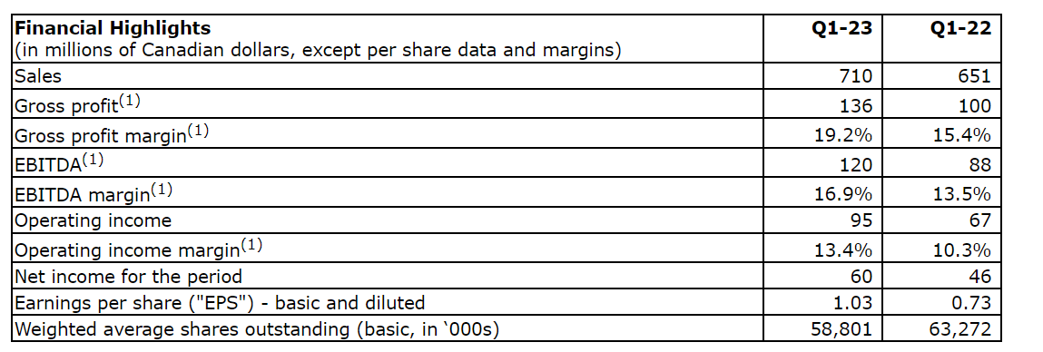In the three-month period ended March 31, 2023, the company repurchased 608,709 common shares for cancellation in consideration of $30-million under its current normal course issuer bid (NCIB). Since the beginning of the NCIB on Nov. 14, 2022, the company has repurchased 1,026,569 common shares for cancellation in consideration of $50-million.