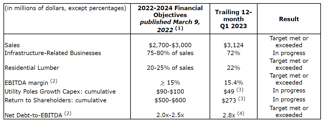 The company continues to be favourably positioned to meet or exceed the financial objectives set for 2024, as summarized in an attached table. Driven by the outperformance of utility poles, sales in 2024 are now expected to exceed the target range. By 2024, utility pole sales are projected to grow at a compound annual rate of 20 per cent from 2022, and the company's EBITDA margin is expected to exceed the 15-per-cent target by approximately 100 basis points.