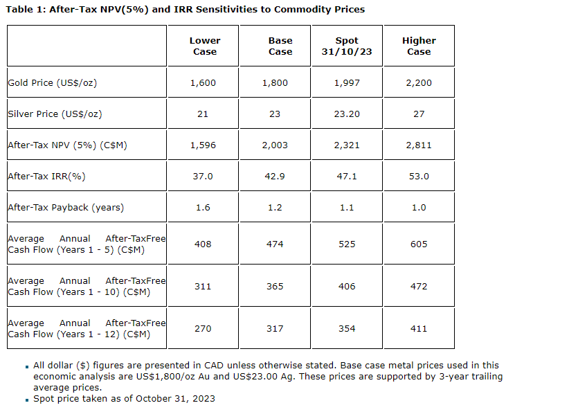 At a $1,800 (U.S.)/oz gold price, $23 (U.S.)/oz silver price and a Canadian-dollar-U.S.-dollar exchange of 74 Canadian cents, the project generates an after-tax NPV (5 per cent) of $2.0-billion and IRR of 43 per cent, based on an effective cash tax rate of 34 per cent. Payback on initial capital is 1.2 years.