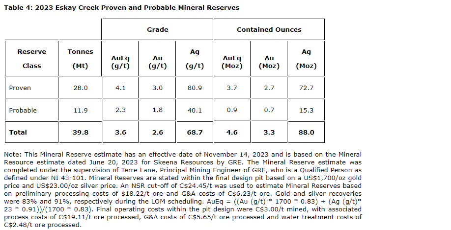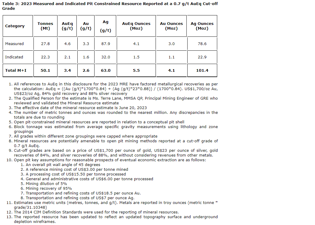 - Proven and probable mineral reserves for open-pit mining of 39.8 million tonnes (Mt) containing 3.3 million ounces (Moz) gold and 88.0 Moz silver (4.6 Moz AuEq);