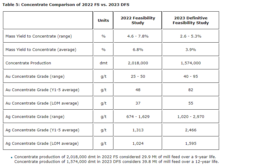 The additional metallurgical testing has shown excellent results in producing a higher-grade gold and silver concentrate with lower concentrate volumes, compared with previous testing. Recoveries for gold were largely unchanged at 83 per cent, slightly conservative based on test results, and silver recoveries increased from 88 per cent to 91 per cent, as compared with the 2022 FS.