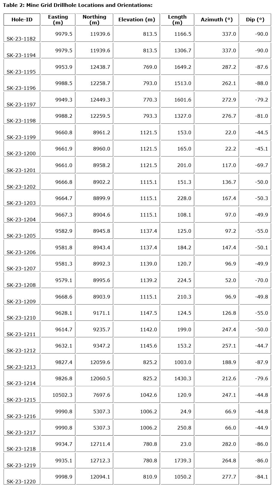 A total of 13 surface drill holes were completed in 2023 with the aim of following up on drill intersections discovered during the 2022 exploratory programs. Drilling in the vicinity surrounding the 22 Zone yielded new occurrences of footwall gold-silver mineralization highlighted by SK-23-1203, which intersected 19.87 g/t Au, 59.1 g/t Ag over 2.95 metres including 64.80 g/t Au, 132.0 g/t Ag over 0.85 metres and a second high grade interval averaging 21.10 g/t Au, 15.4 g/t Ag over 1.50 metres . Additional mineralization was identified 200 metres north of the 22 Zone by SK-23-1200 grading 0.63 g/t Au, 86.1 g/t Ag over 14.50 metres and 1.37 g/t Au, 7.6 g/t Ag over 5.00 metres . These new intersections are not expected to materially affect the existing open-pit Resources and Reserves in the 22 Zone.
