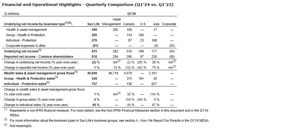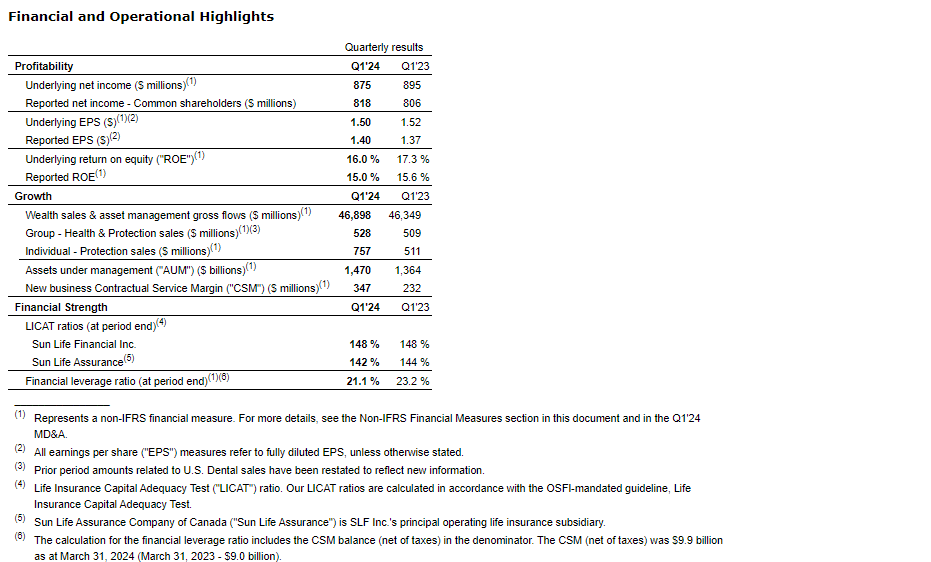 Sun Life Financial Inc. has released its results for the first quarter ended March 31, 2024.