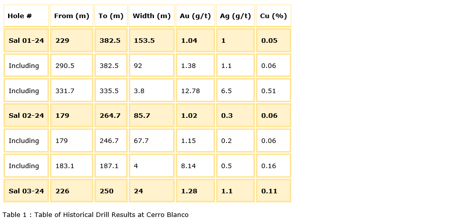 - The maiden drill program at Cerro Blanco reported significant gold intercepts from all three holes (up to 153 metres (m) grading 1.04 grams per tonne (g/t) gold in SAL 01-24), which were collared approximately 500 metres apart.