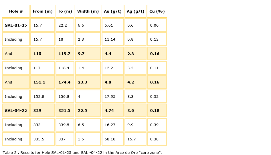 IP recently completed (May, 2025) over the NW extension of Arco De Oro identified numerous strong chargeability anomalies supported by artisanal workings at surface. Line D8 is in excess of 3.9 km along strike to the northwest of San Lorenzo's earlier drilling at Arco de Oro -- in the Arco de Oro core zone. Previous work on the trend included the drilling of SAL 01-25 and SAL 04-22. Assay results from SAL 01-25 and SAL 04-22 -- drilled in the Arco de Oro core zone -- are presented in table 2.