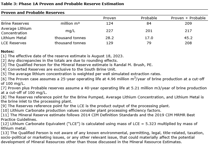 The total proven and probable brine reserves for phase 1A are estimated at 208,000 tonnes of LCE or 45,200 tonnes of elemental lithium at an average lithium concentration of 217 mg/l. In simple terms, the reserves for the DFS are a quantification of the lithium that can be produced by the existing operational brine wells in the south unit over the lifetime of the project. The reserves do not contemplate any other lithium production that could take place either from the other operational brine supply wells across the Lanxess facilities in El Dorado or from future additional wells that could be used to supplement or bolster lithium production.