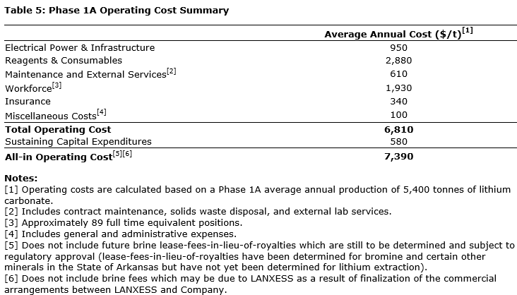 The operating cost over the life of the phase 1A is $6,810 per tonne of Li2CO3. All-in operating cost, including sustaining capital expenditures and assumed brine fees, is $7,390 per tonne.