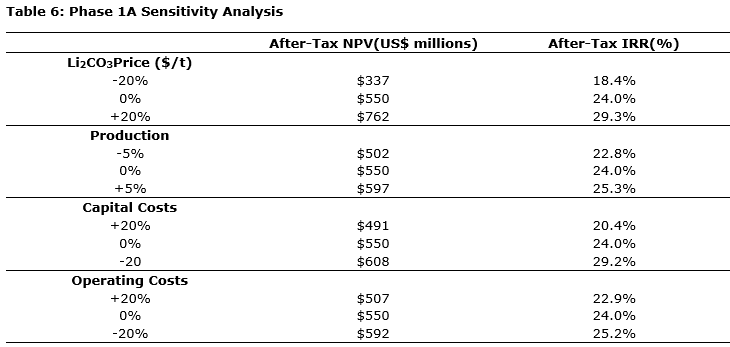 Strong project economics: after-tax net present value of $550-million and internal rate of return of 24 per cent assuming discount rate of 8 per cent and a long-term price of $30,000 per tonne for battery-quality Li2CO3;