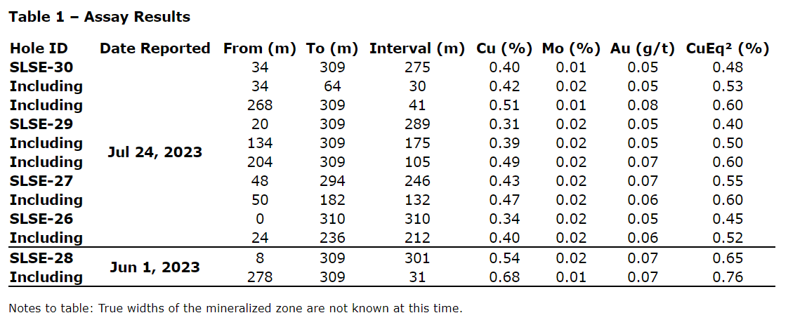 These holes follow discovery hole SLSE-28, which returned an open-ended interval of 301 m of 0.65 per cent CuEq in a favourable andesite porphyry host (see press release dated June 1, 2023), and help establish the geometry of the upper part of the system and vectors for further drilling.