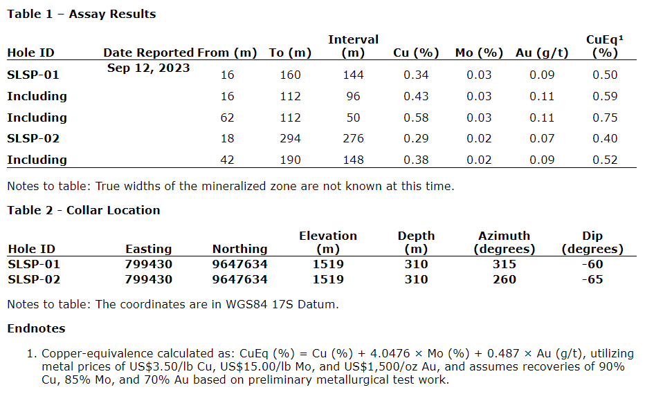- SLSP-01 was drilled northwest and returned 50 metres of 0.75 per cent copper equivalent or 96 m of 0.59 per cent CuEq within a broader interval of 144 m of 0.50 per cent CuEq from surface before entering the weakly mineralized dacite porphyry stock.