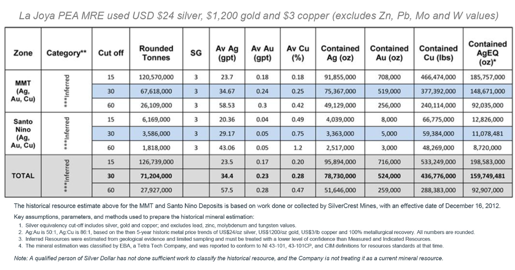 The previous operator, Silvercrest Mines, released a preliminary economic assessment (PEA) National Instrument 43-101 technical report for the property in December, 2013. The PEA included a mineral resource estimate (MRE) for only the MMT and Santo Nino deposits (see the attached historical MRE table) that was primarily based on Silvercrest's drilling between 2010 and 2012. The MRE was reported to conform to CIM definitions and standards for resource estimation at that time. However, a qualified person of Silver Dollar has not done sufficient work to classify the historical resource and the company is not treating it as a current mineral resource. Independent data verification and an assessment of the mineral resource estimation methods are required to verify the historical mineral resource.