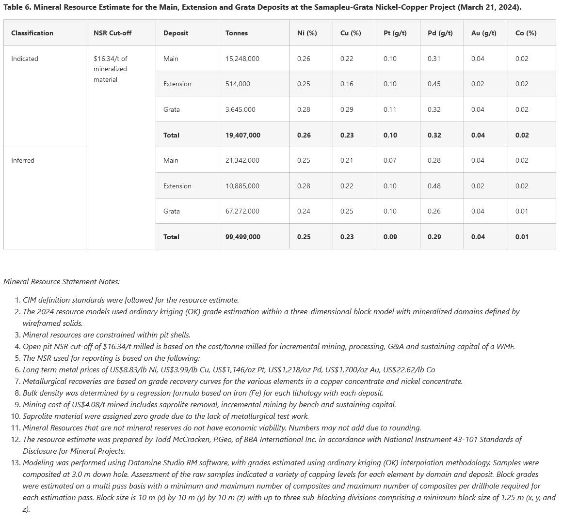 the Samapleu-Grata nickel-copper project, prepared under National Instrument 43-101, including the 2024 PEA and updated mineral resource statement, will be filed and available on SEDAR+ within 45 days from the date of this news release.