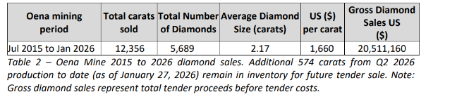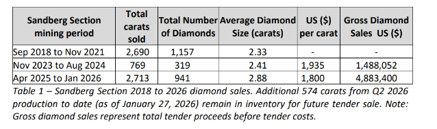 • Gross diamond sales (total tender proceeds before tender costs): approximately $1.90-million (U.S.), a 29-per-cent increase over Q4 2025;