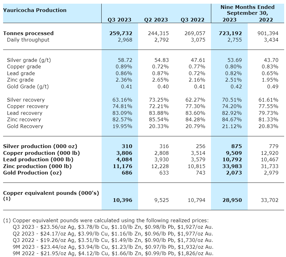 Consolidated throughput in Q3 2023 was 4 per cent lower than in Q2 2023 but 25 per cent higher than in Q3 2022. Throughput from the Yauricocha mine during Q3 2023 of 259,732 tonnes was 6 per cent higher from the previous quarter. The Bolivar mine throughput in Q3 2023 increased by 59 per cent over Q2 2022 but declined 11 per cent compared with Q2 2023, as anticipated.